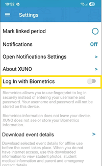 To turn on Biometric Log In, open the Settings menu on your phone and switch on the “Log In with Biometrics” option.