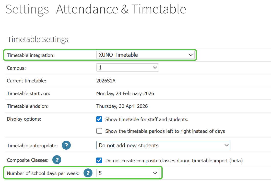 - At the top of the page, make sure that the Timetable integration: option is set to XUNO Timetable. If it isn't, select it from the dropdown list and click the Save button at the bottom of the page.